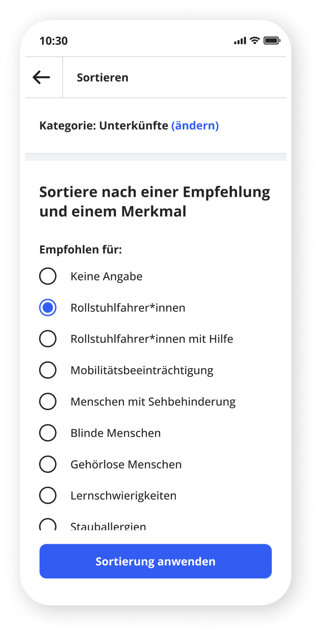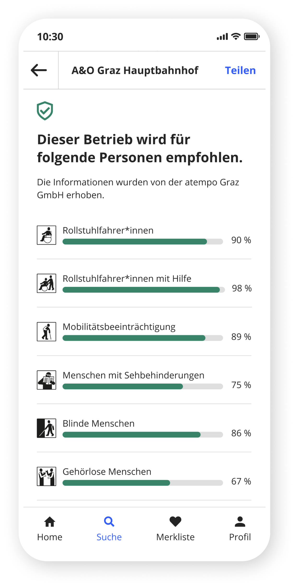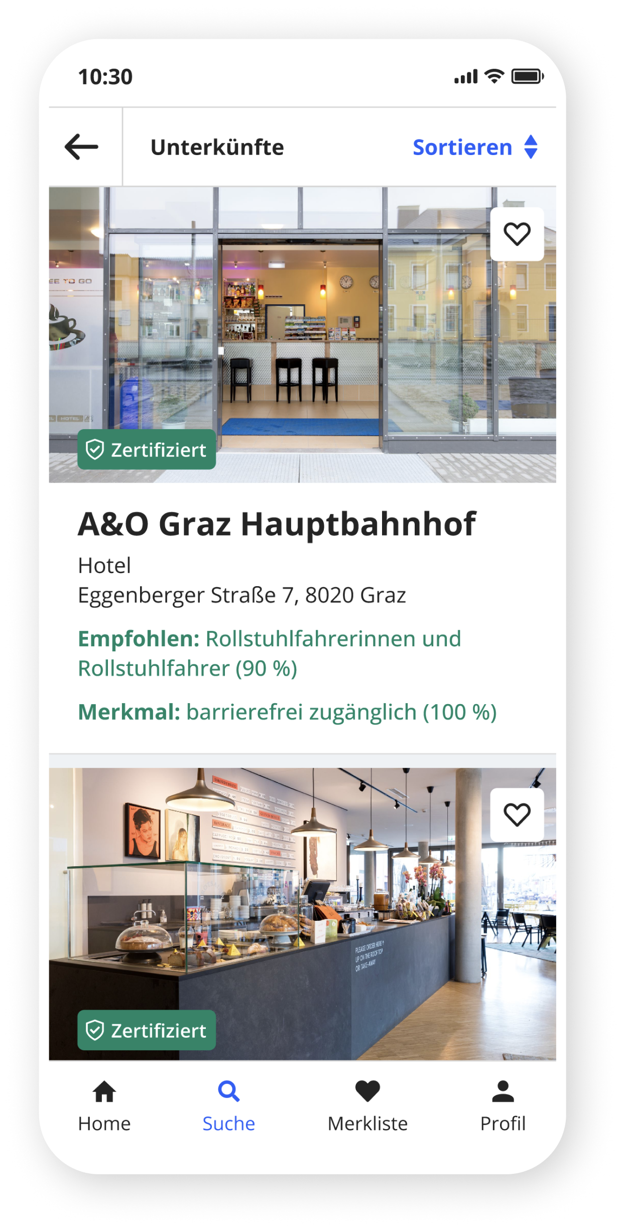 Zertifizierte Betriebe enthalten wichtige Informationen zur Barrierefreiheit vor Ort. Die Nutzerinnen und Nutzer können selbst entscheiden, ob die Gegebenheiten vor Ort für Sie passend sind. Die Zertifizierung erfolgt durch Expertinnen und Experten und kann optional beantragt werden.